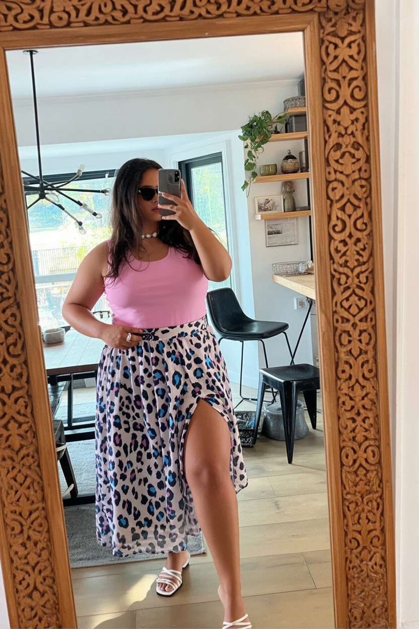 This look is playful, confident, and full of personality. The soft pink tank brings a fresh, feminine feel, while the bold printed skirt adds just the right amount of drama. It’s the kind of outfit that feels fun to wear—flirty without trying too hard and perfect for embracing spring energy.