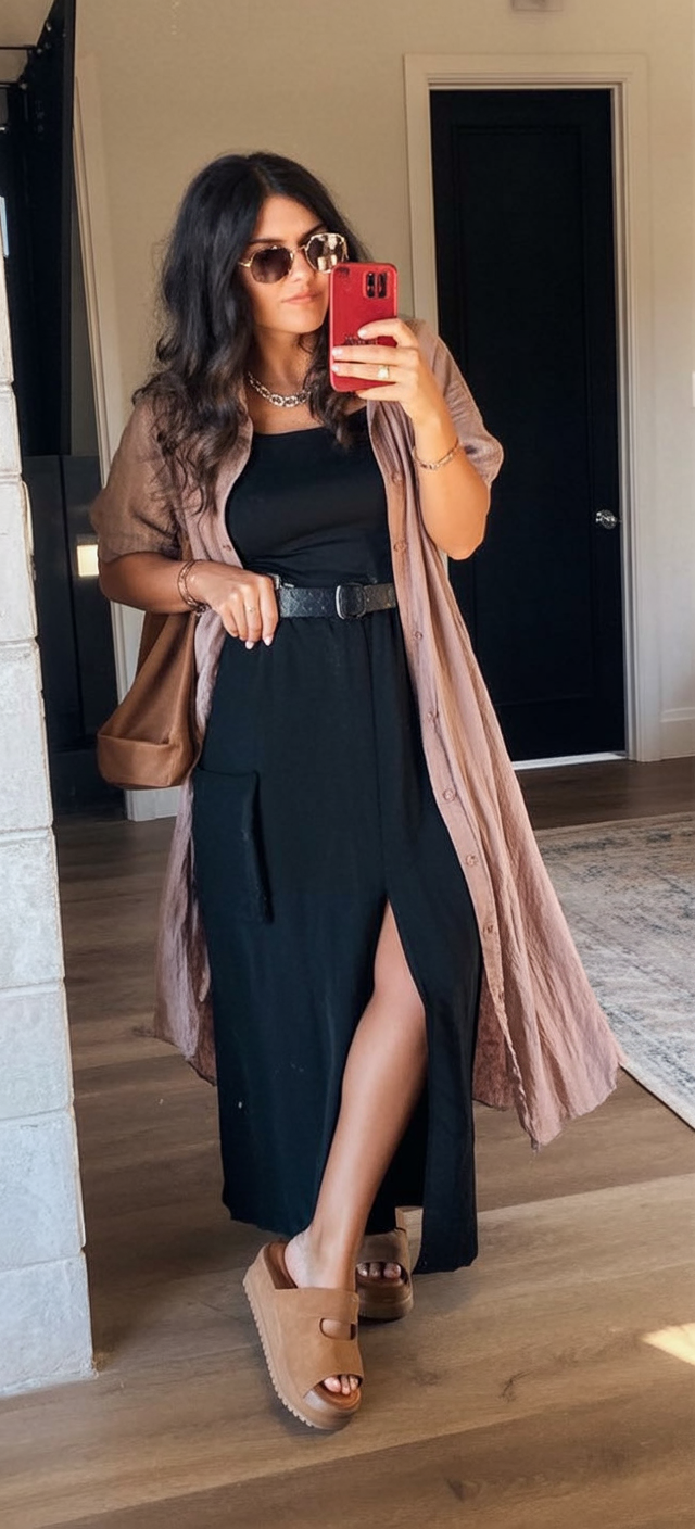 This outfit feels confident, calm, and quietly powerful. The black dress creates a strong base, while the lightweight outer layer softens the look and adds movement. It’s the kind of outfit that feels grown-up without feeling stiff.