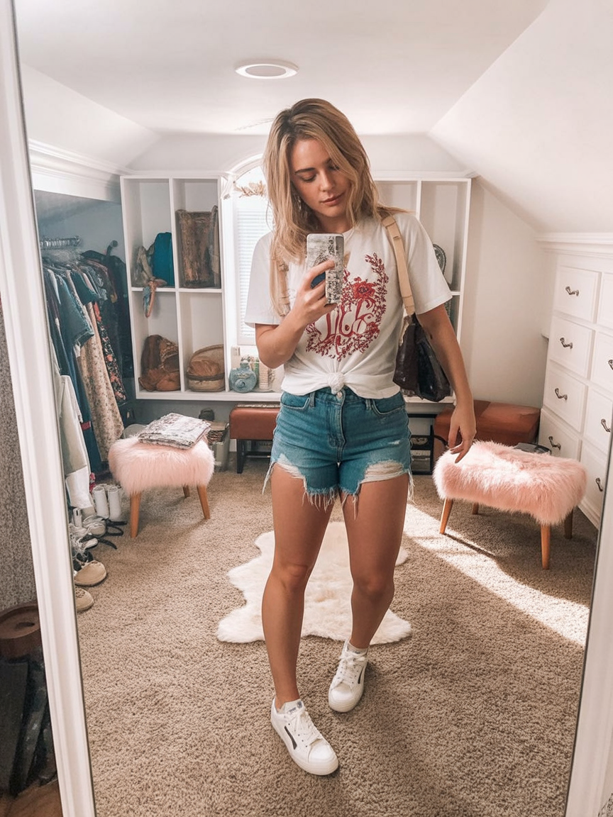 Some outfits just feel like home, and this is one of them. A knotted tee with denim shorts has that laid-back confidence that never feels dated. It’s easy, breezy, and perfect for warmer spring days when comfort is non-negotiable but style still matters.