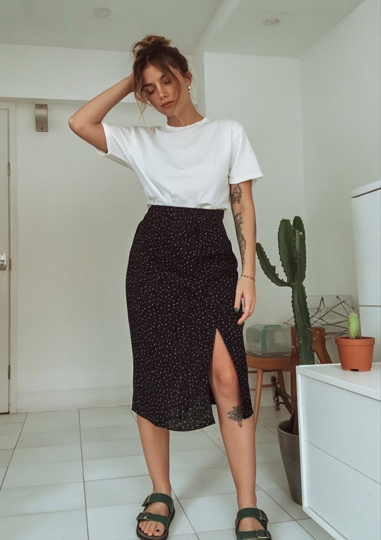 There’s something effortlessly chic about a crisp white tee paired with a midi skirt. It’s understated, clean, and quietly confident. This look doesn’t chase attention—it earns it through simplicity and balance.