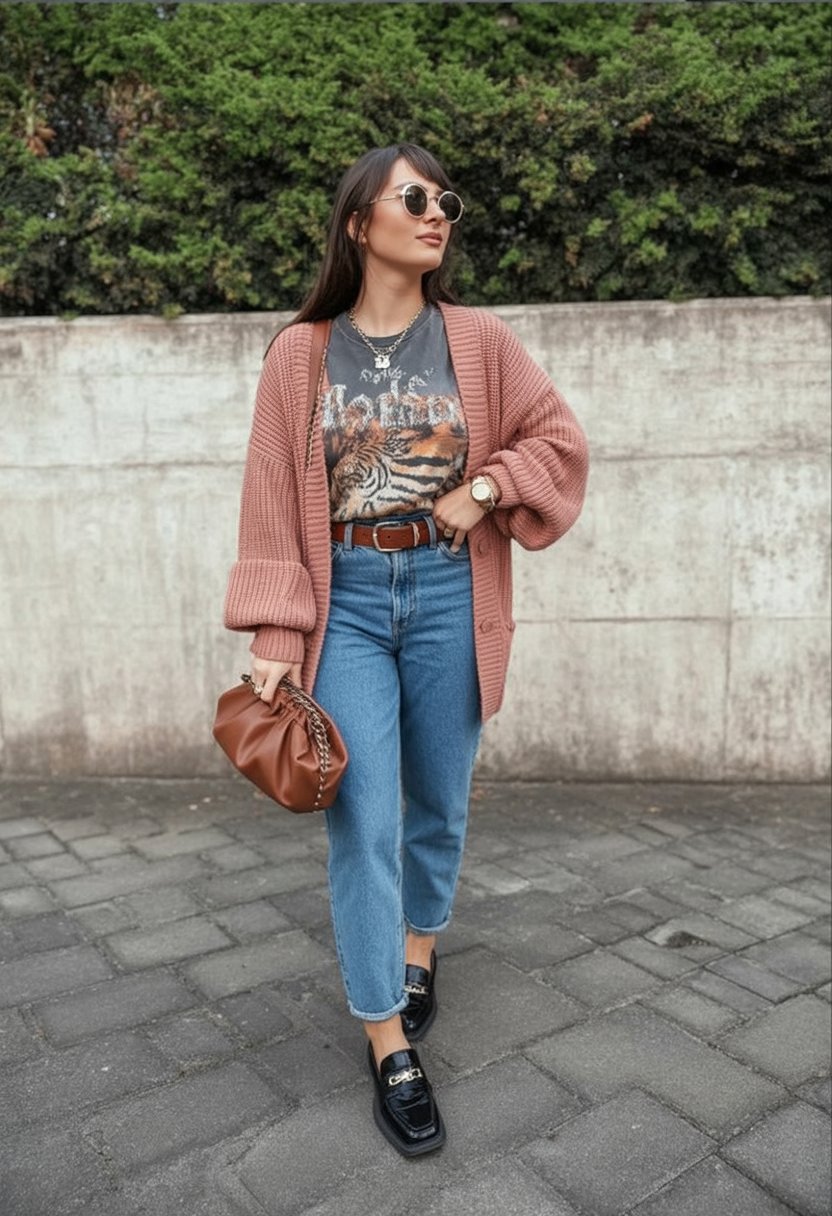 This outfit feels like your favorite coffee order—comforting, familiar, but still exciting. A soft cardigan layered over a graphic tee and relaxed jeans creates a look that’s warm, approachable, and full of personality. It’s casual but never boring.