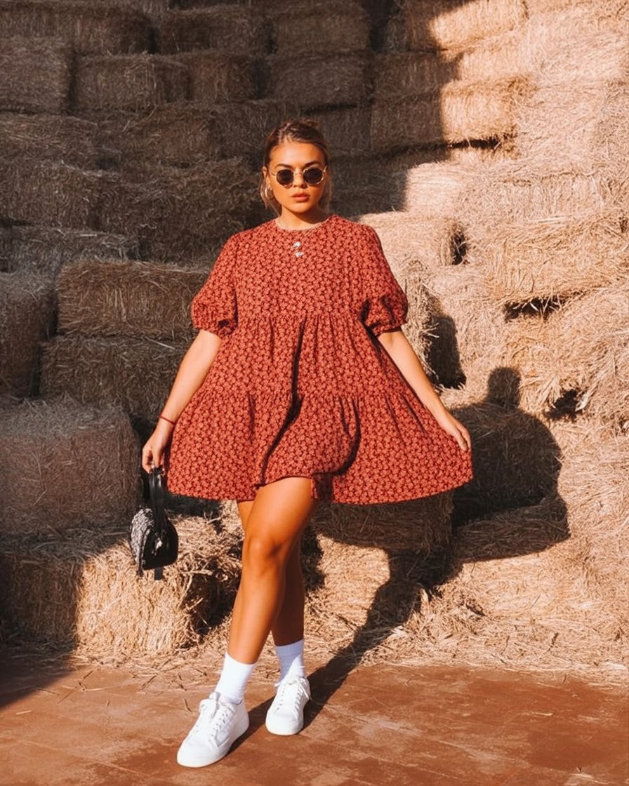 This look feels joyful, relaxed, and a little playful—perfect for spring days that call for movement and comfort. The loose babydoll shape paired with crisp sneakers creates an outfit that feels young in spirit but totally wearable at any age.