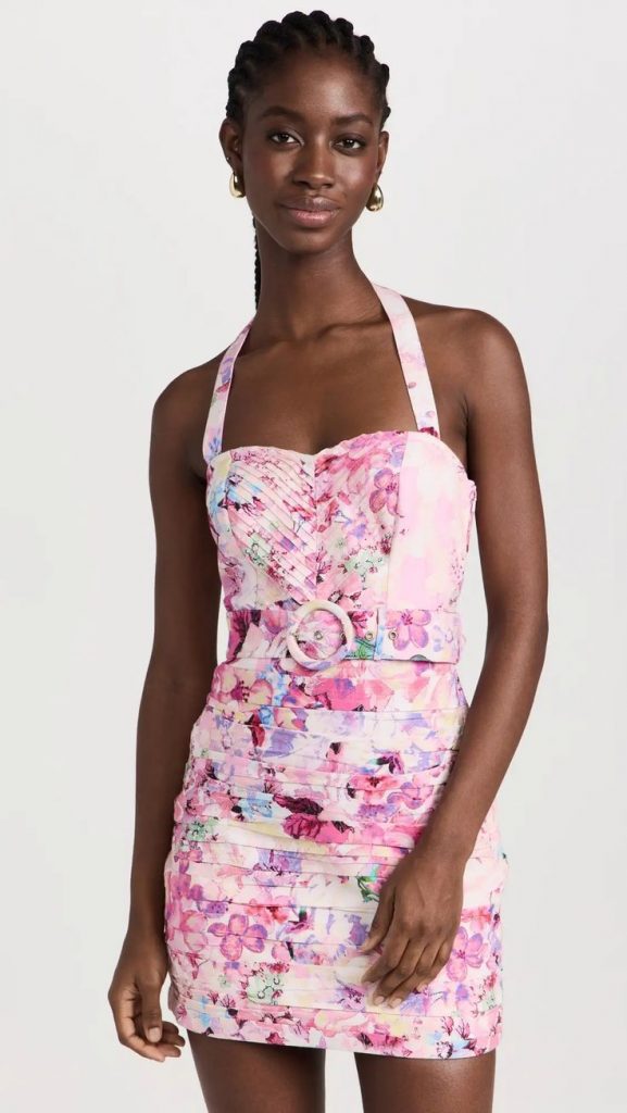 Spring forward with this pastel pink number that blooms with a floral frenzy. The dress is a canvas of color, perfect for any party casual or chic event. It’s a fresh take on spring fashion that brightens any room.