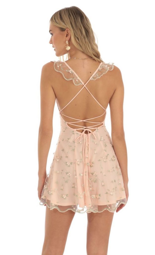 A gentle pink hue and delicate lace come together in this dress to create a vision of pastel perfection. The detailed back adds intrigue, making it perfect for a party night where every angle is a statement.