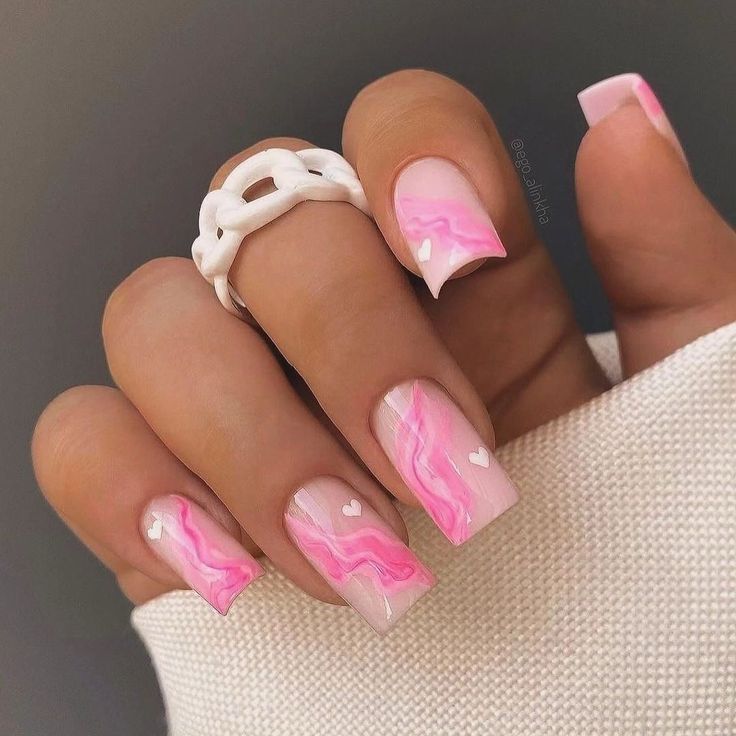This manicure combines pink marble swirls with tiny white heart accents, creating an ethereal look. The art design exudes a soft, dreamy quality, perfect for those who love feminine and intricate nail ideas. The medium square nail shape offers a balanced and modern aesthetic.