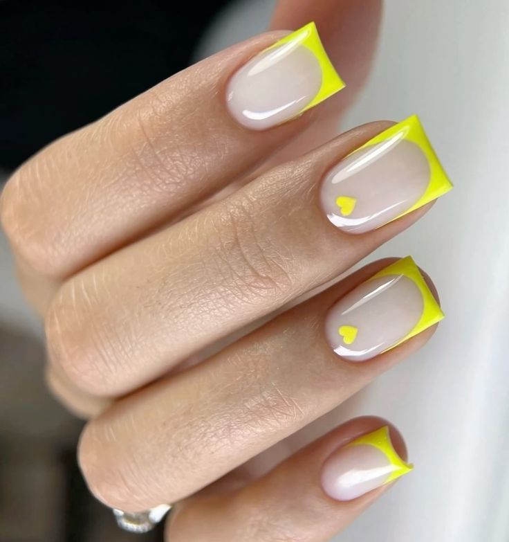 For those seeking a vibrant yet minimalist style, these yellow French tips with tiny heart accents are the perfect pick. The short, rounded nails provide a playful and modern touch, combining classic French styling with a bold, unexpected color.