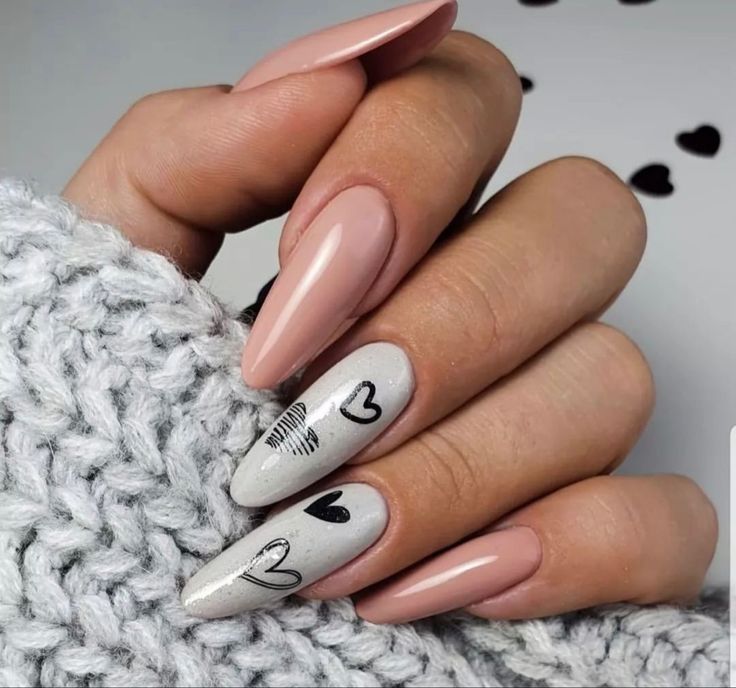 This neutral nail art design combines a nude base with bold black hearts, creating a chic yet minimalist look. The almond shape adds sophistication, while the design remains versatile for various Valentine’s events.
