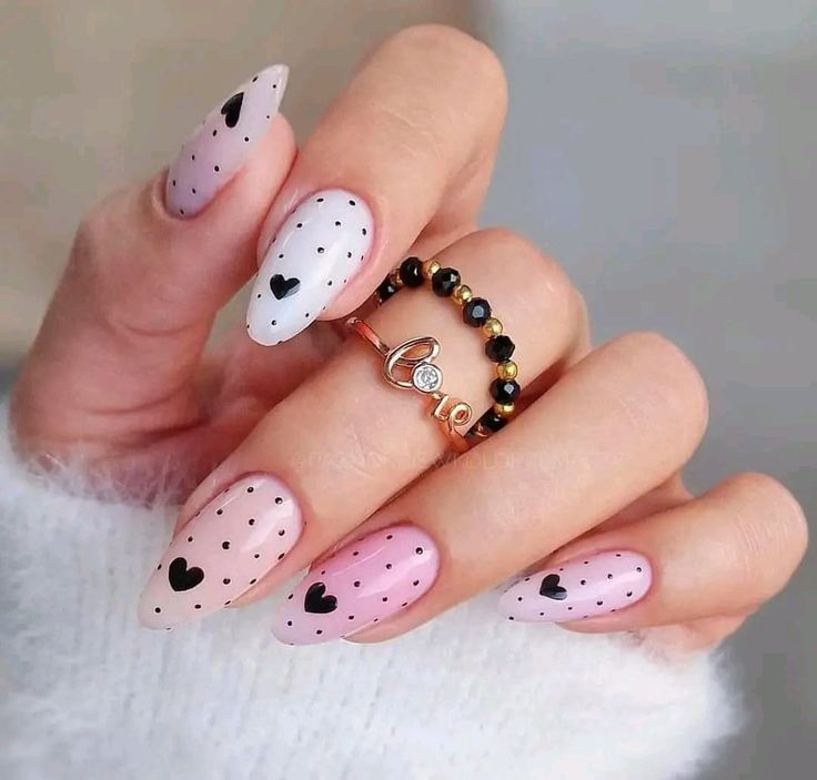 This cute design features pastel pink and white nails adorned with tiny polka dots and black hearts. The overall effect is both playful and elegant, suitable for casual outings or daytime dates.
