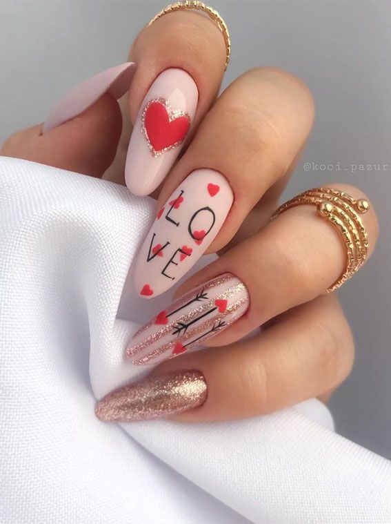 This design blends nude tones with glittery accents and Valentine’s motifs, including red hearts and the word “LOVE.” It’s perfect for those who want to make a bold yet sophisticated statement this Valentine’s Day.
