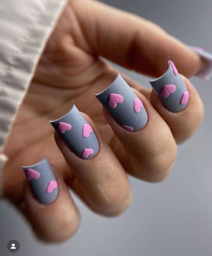This minimalist design combines a matte grey base with textured pink hearts for a soft yet modern Valentine’s look. The short, square nail shape keeps it practical, while the raised hearts add a playful 3D effect that draws attention.
