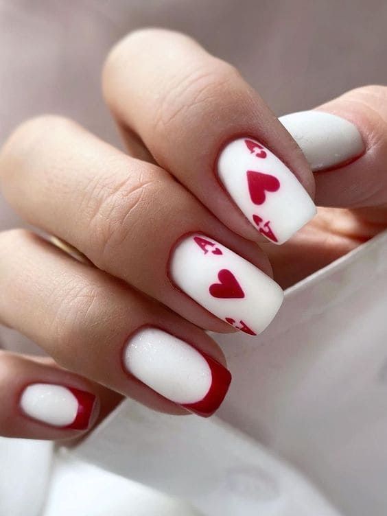 Channel your inner romantic with this art design featuring playing card-inspired red hearts on a crisp white base. The short nails with clean lines ensure a sleek and polished finish, perfect for formal Valentine’s events or date nights.