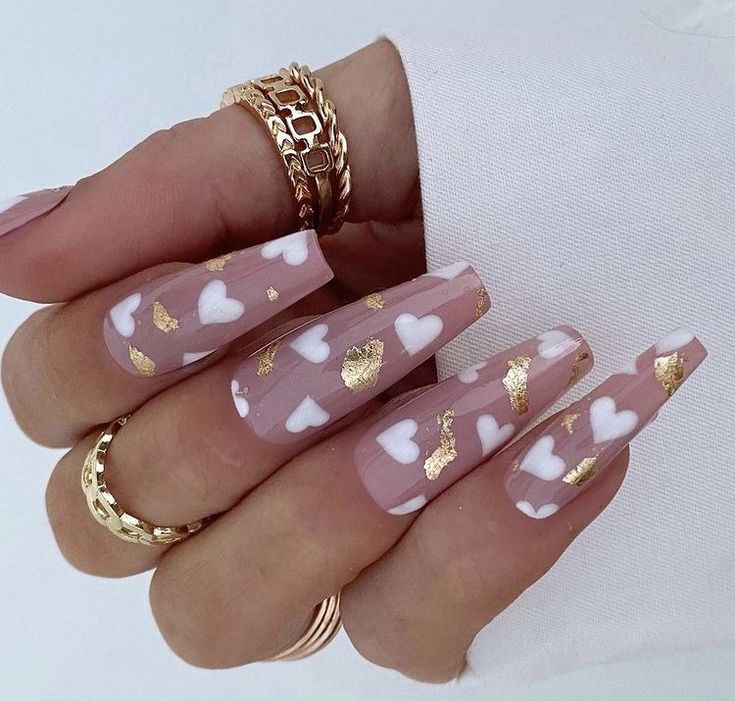Elevate your Valentine’s look with this luxurious design featuring a nude base adorned with white hearts and flecks of gold foil. The long, coffin-shaped nails exude elegance and sophistication, ideal for upscale dinners or galas.
