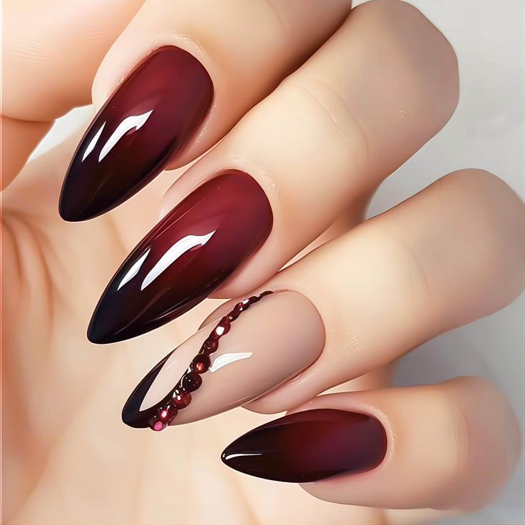 This almond nail shape transitions effortlessly from deep red to subtle nude, creating an enchanting ombre design. The addition of delicate gemstones on accent nails elevates the look, making it suitable for upscale events or celebrations. This style balances sophistication with a playful touch, appealing to those who love art designs with a luxurious edge.