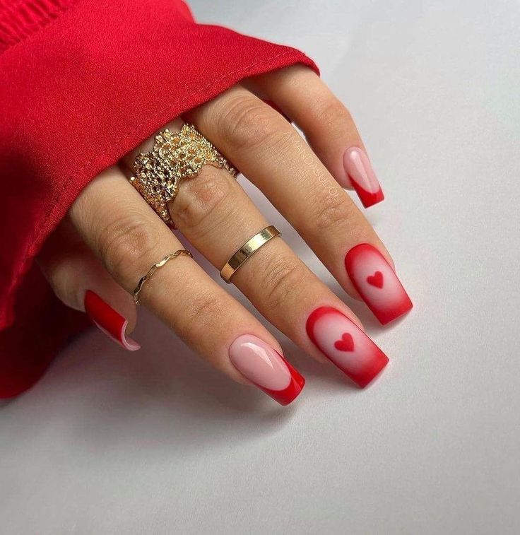 This striking design features an ombre effect transitioning from deep red tips to a soft nude base, accented with delicate heart details. The square nail shape and glossy finish make it a bold yet polished option for Valentine’s Day.