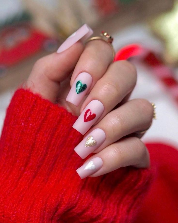 For a festive and glamorous vibe, this design features glittery red, green, and gold hearts on a soft matte pink base. The short square nails keep the look chic and balanced, perfect for Valentine’s gatherings or romantic dinners.