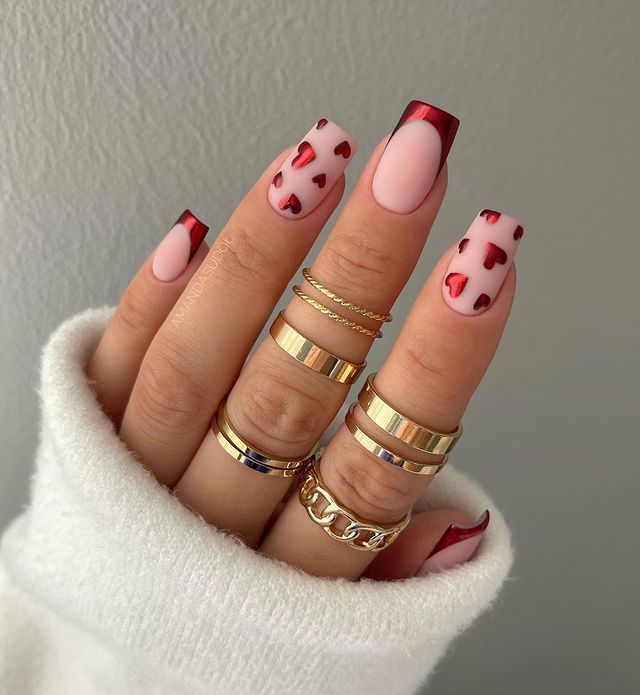 A creative take on classic French tips, this design features metallic red accents and scattered heart patterns on a nude base. It’s a subtle yet cute nail design that embodies the spirit of Valentine’s Day without being over-the-top.