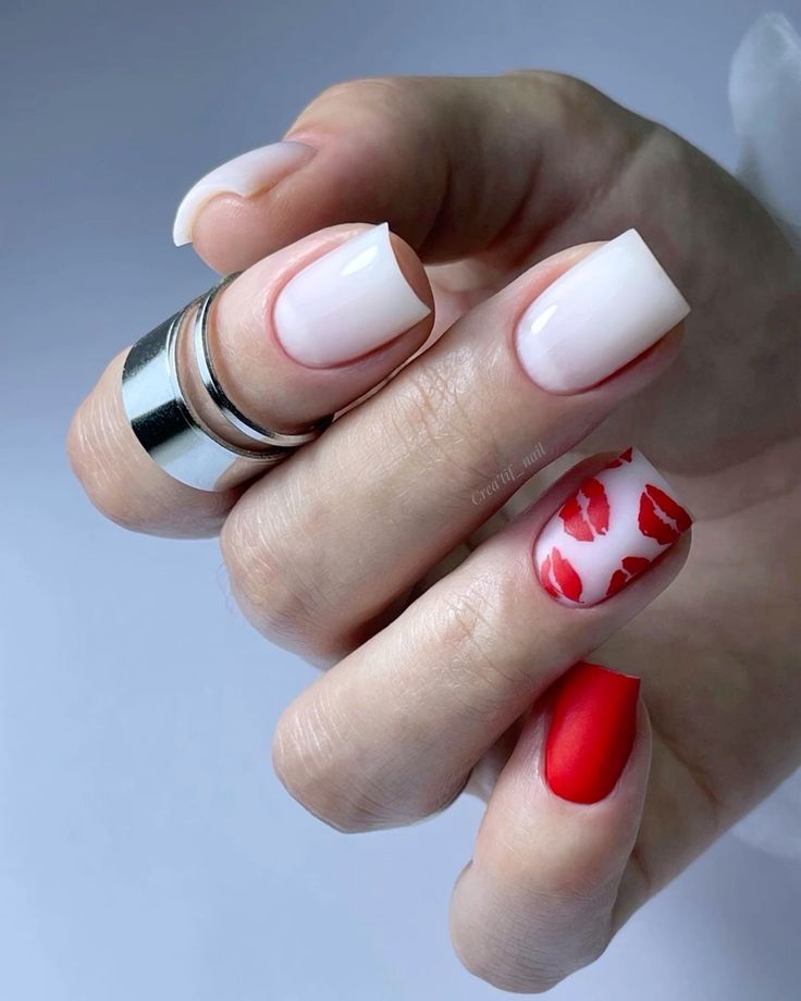 For a playful Valentine’s vibe, this design incorporates bright red lips and a glossy red acrylic accent nail. It’s bold, fun, and flirty—perfect for a night out or a themed Valentine’s party. The mix of patterns ensures each nail tells its own story while maintaining a cohesive look.