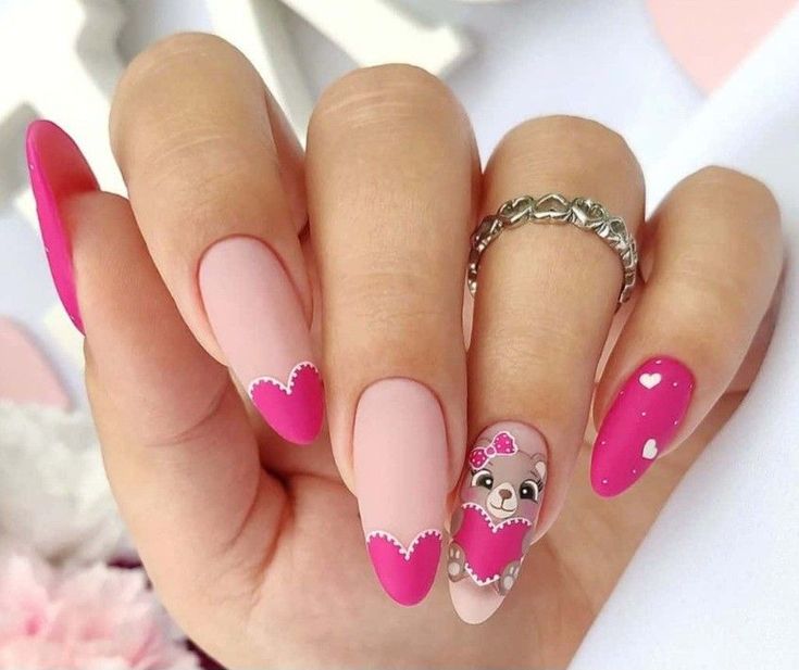 For a cute and fun Valentine’s look, this design features intricate pink heart patterns paired with a cartoon bear detail. It’s playful and perfect for those looking to embrace their youthful, creative side.