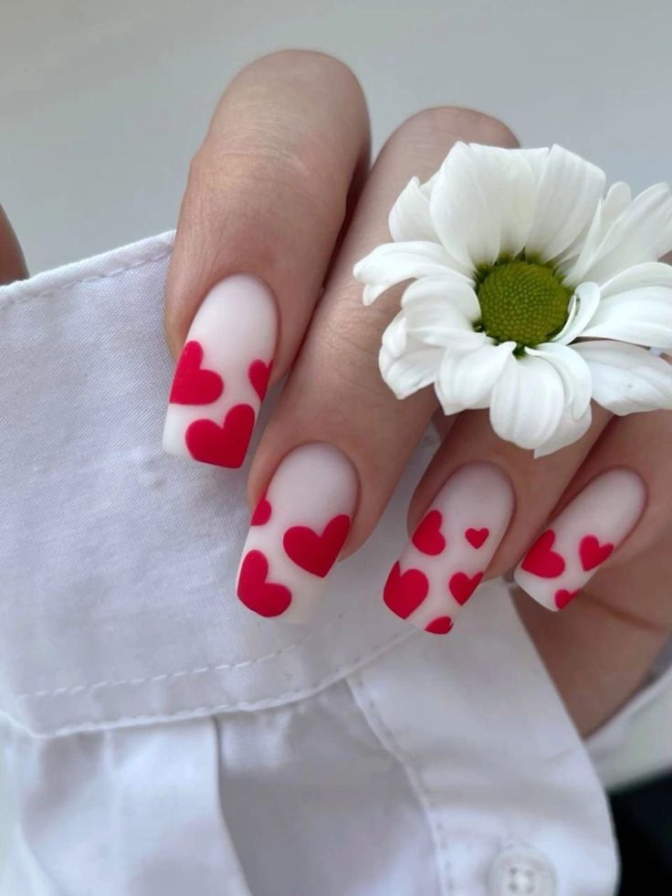 This design features a delicate matte base adorned with vibrant red hearts that cascade across the nails. The color pattern is both romantic and timeless, ideal for those who prefer subtle yet cute art designs. The square nail shape enhances the clean aesthetic, making this style perfect for a romantic day out.