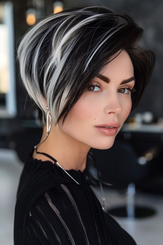 For those who love to stand out, this high-contrast bob with silver streaks is a bold and edgy choice. The deep, dark base color is sharply contrasted by bright silver highlights, creating a dramatic look that’s perfect for the winter season. This style works well for women who enjoy making a statement with their hair, and it pairs beautifully with monochrome winter outfits that allow the hair to be the star of the show. The silver streaks also add a futuristic vibe, making it a trendy choice for 2024.