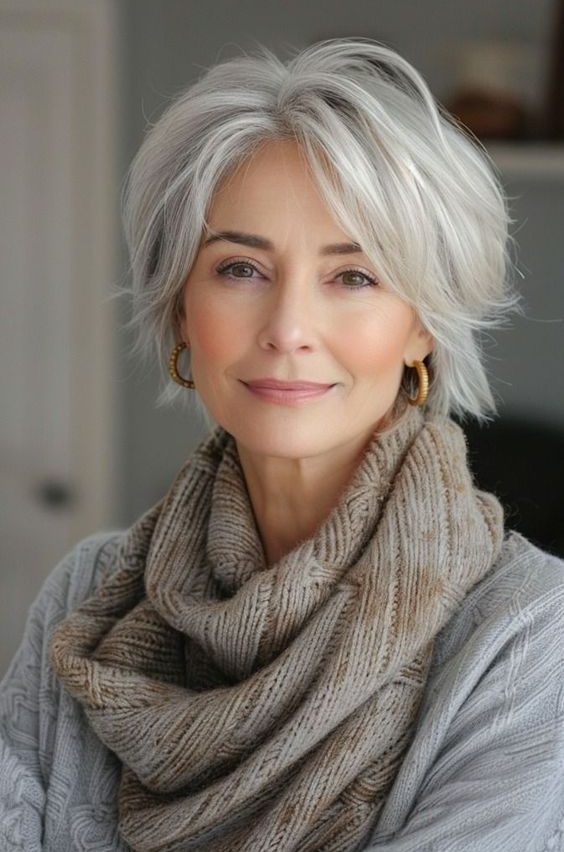 For women embracing their natural gray or silver hair, this layered bob is a sophisticated choice that highlights the beauty of mature hair. The layers add movement and texture, preventing the hair from looking flat, while the blend of silver and white tones creates a chic, monochromatic effect. This style is perfect for pairing with classic winter outfits, such as wool coats and cashmere sweaters, making it a refined option for the colder months. It’s a cut that exudes elegance and confidence, perfect for the modern woman.