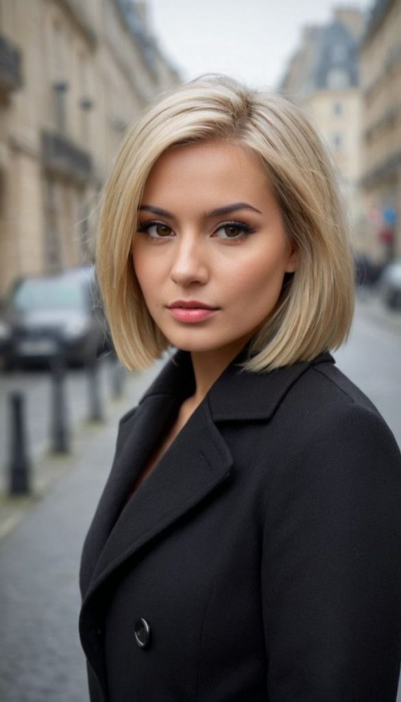 For a bold, high-fashion look, this sleek platinum blonde bob is the way to go. The cut is sharp and clean, with a subtle side part that adds a touch of asymmetry for visual interest. The platinum blonde color is striking against winter’s darker palettes, making it a standout style. This bob pairs beautifully with sleek, tailored outfits and is perfect for women who want to make a strong, confident statement. The smooth finish of the hair ensures that it always looks polished, making it ideal for both professional settings and upscale events.