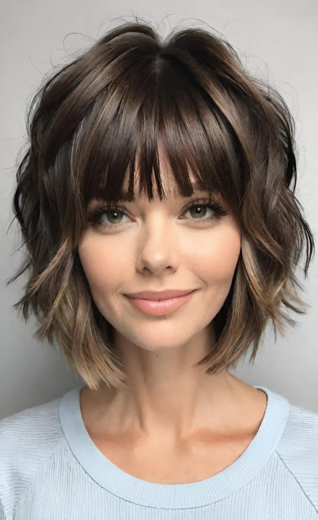 This textured bob with wispy bangs offers a playful and youthful vibe, making it perfect for the winter season. The layers add depth and volume, preventing the hair from appearing flat, which is especially important when dealing with winter’s often dry and static-inducing air. The bangs are feathered and slightly tousled, giving the overall look a casual yet put-together feel. This style works beautifully with hair color short brown shades, adding warmth and dimension to the cut. It’s an ideal choice for women who want a fun, flirty look that’s easy to manage during the colder months.