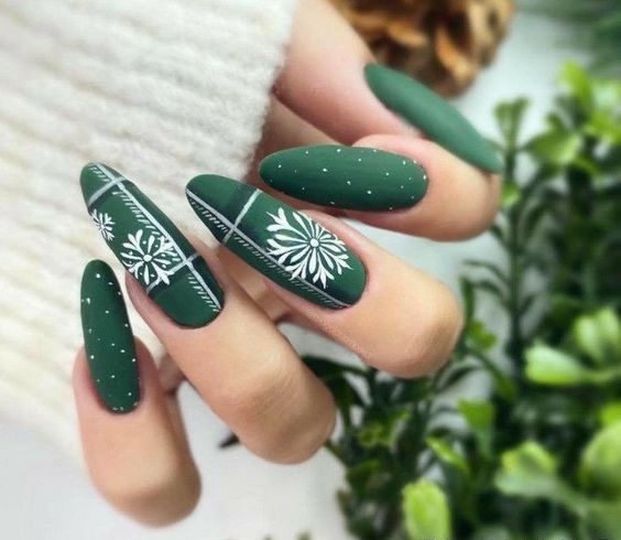 For a 2024 trend that merges boldness with creativity, these matte green nails with intricate white winter patterns are a showstopper. The almond shape provides an elegant canvas for the design, while the white floral-like snowflakes give it a festive twist. This look is both festive and refined, making it suitable for office holiday parties or formal winter events. Matte nails will continue to be a huge trend in 2025, so this is a look to carry through the season.