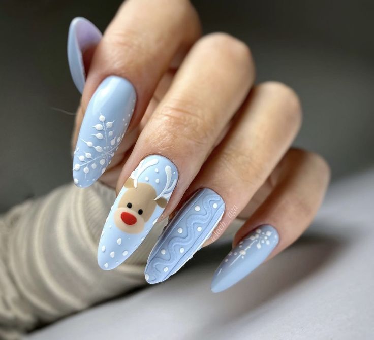For a playful yet cute winter look, this powder blue manicure features an adorable reindeer design with snowflake accents. The long almond shape gives the design room to breathe, allowing the intricate art to stand out. The cool-toned blue and white combo makes this perfect for the entire winter season, not just the holidays. This design is especially great for those who love a bit of winter fun and want to show off their personality through their nails.