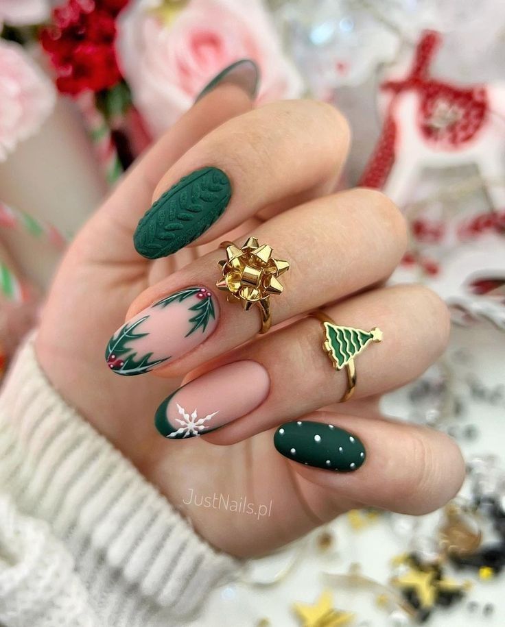 This elegant combination of deep green and winter accents will instantly elevate your holiday manicure. The square shape adds a modern touch, while the intricate snowflake and holly designs on two accent nails create a festive vibe. The glossy finish of the green base contrasts beautifully with the delicate winter motifs. This look is perfect for formal events or Christmas dinners, bringing together tradition and elegance in one nail art idea. 2024 trends suggest deep, earthy colors will be big, making this a must-try for the season.