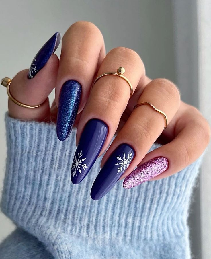 These stunning blue nails capture the essence of a cold winter’s night, with deep midnight tones complemented by shimmering sparkle accents. The snowflake designs on two nails create an icy winter vibe, while the round shape gives these nails an elegant finish. Adding a touch of pink glitter to one nail brings just the right amount of festive fun to this gel polish look. It’s a beautiful combination of 2024 trends in nail art—frosty colors with a glamorous twist.