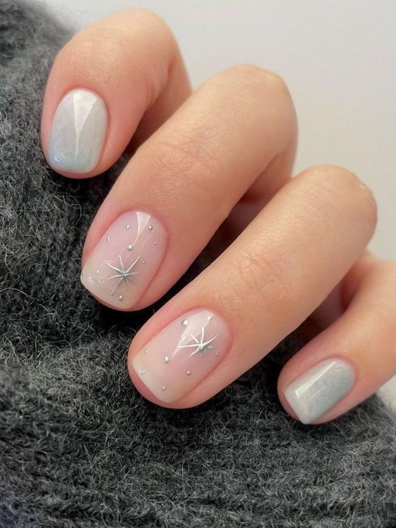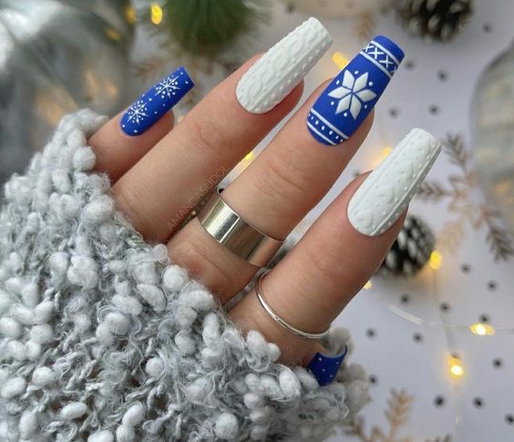 This nail design is a nod to classic Nordic winter sweater patterns, featuring blue and white accents. The short square shape makes this look practical, while the matte and glossy finishes offer a modern twist. Detailed with snowflakes and cozy knit textures, this design is perfect for the colder months and aligns with 2024 trends of incorporating cozy, winter-wear elements into nail art. It’s a great way to make your nails an extension of your winter wardrobe.