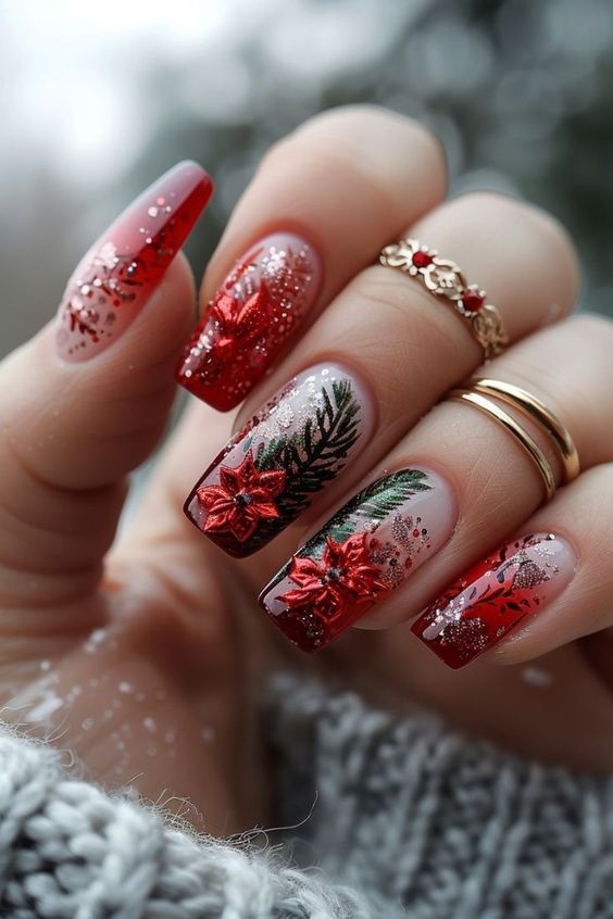 For those who want to go all out with their holiday nails, this red and glittery manicure is a must-try. The stunning poinsettia flowers, combined with frosted green accents, make this design perfect for Christmas. The short almond shape keeps the nails from looking too dramatic, while the glossy finish gives them a festive, polished look. This is a more intricate gel nail art idea for anyone who loves to make a statement during the holidays.