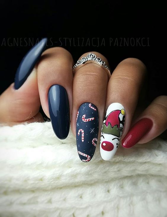 Add a bit of whimsy to your winter nails with this adorable nail art that features candy canes, reindeer, and stars. The deep blue background and accent nails in red and white create a fun and festive combination. The oval shape allows for detailed designs while keeping the nails practical. This look is perfect for Christmas parties or family gatherings, embracing the playful side of winter.