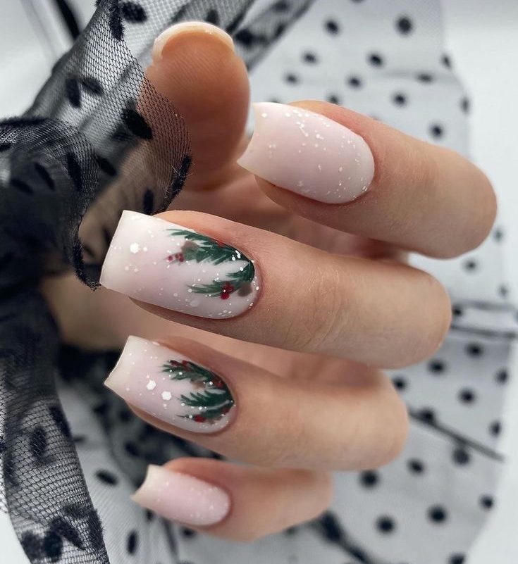 For a more understated holiday look, this simple design features soft snowy greens on a white base, accented with subtle pine branches. The short square shape is practical, making this a versatile design for both holiday parties and everyday winter wear. The light touches of snowflakes and winter foliage give the nails a fresh, clean look. It’s perfect for those who want a cute winter theme without too much fuss, staying in line with 2025 trends of minimalism.