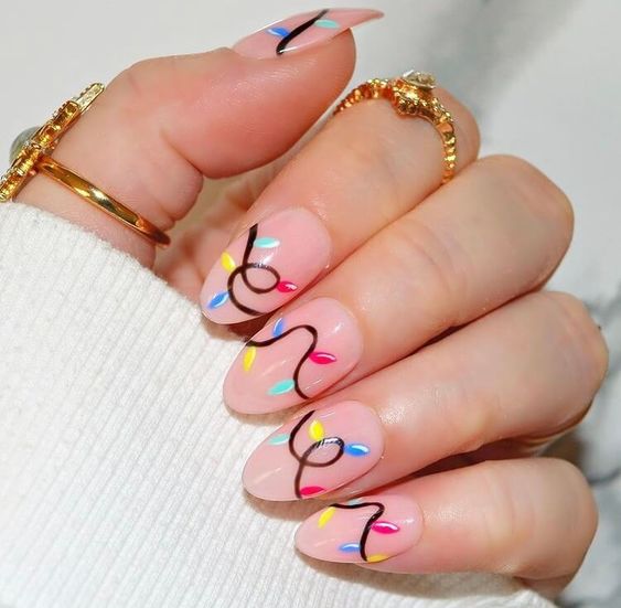 For a playful, festive look, these nails are adorned with colorful Christmas lights. The round shape allows for more creative freedom when it comes to design, making these nails stand out. This bold, cute take on holiday decor incorporates short almond nail shapes and bright, multi-colored lights drawn across the nails. It’s fun, festive, and will undoubtedly spark joy during holiday gatherings.
