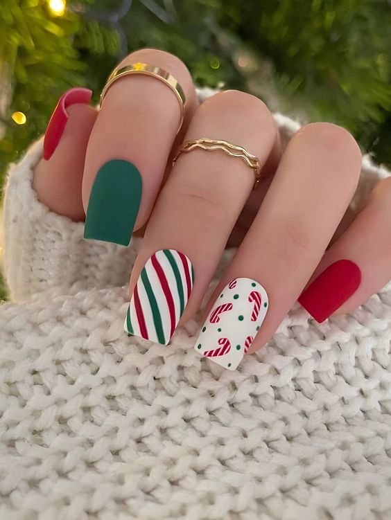 A simple yet festive nail art idea, this manicure combines holiday stripes and candy canes in a short square nail shape. The bold red and green combination brings instant holiday vibes, while the short length keeps the design clean and versatile. Ideal for both parties and day-to-day wear, this design is an excellent balance between fun and sophisticated. It’s a great look for women who want something eye-catching yet classic.