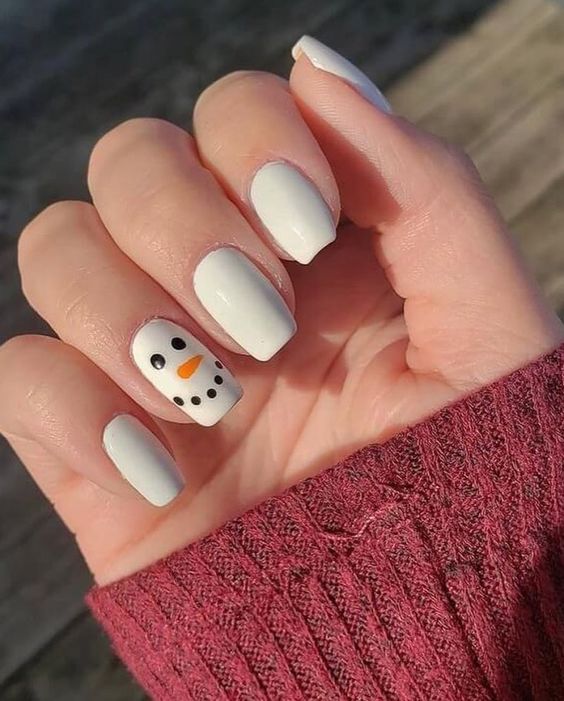 This short and fun winter nail design features an adorable snowman accent nail that will bring out your inner child. The rest of the nails are kept in a crisp white, allowing the snowman detail to stand out. The short square shape adds to the playful nature of this cute winter-inspired manicure. It’s the perfect choice if you’re looking to embrace a more whimsical side this holiday season.