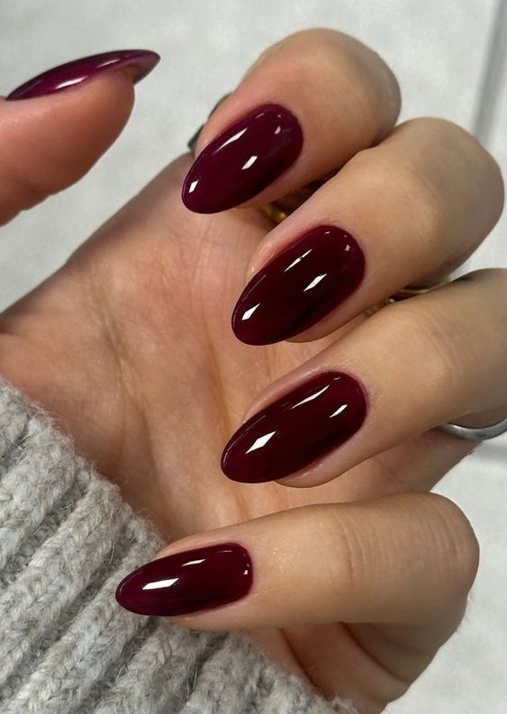 For those who love classic winter tones, this deep red gel polish will be your go-to. The elegant oval shape enhances the sophistication of this rich color, making it a timeless choice for any winter event, from casual outings to formal holiday dinners. This red shade is versatile, allowing you to pair it with any winter outfit, while the gel polish gives it a glossy, long-lasting finish. It’s a simple yet bold statement for the winter months.