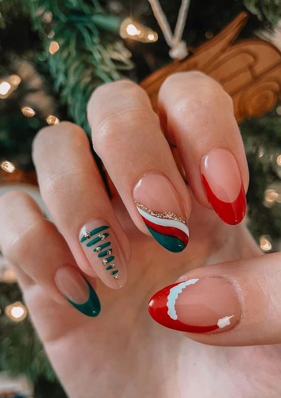 Combining playful holiday motifs like Christmas trees and Santa hats, this cute manicure brings a whole new level of fun to the table. The short almond nails provide ample room for intricate designs while keeping the overall look festive. The combination of red, green, and glittery accents adds a touch of glamour, perfect for holiday parties. These nails are a great conversation starter and bring a smile to anyone who sees them.