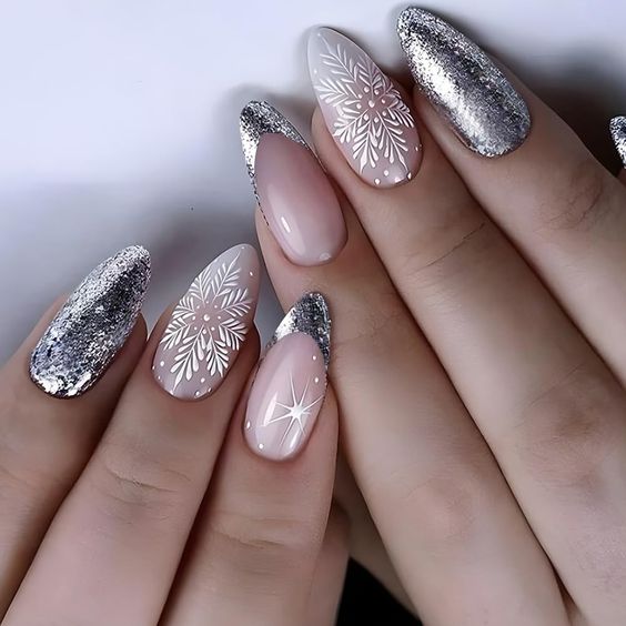 This winter nails design is all about the balance of sparkle and delicacy. The nails feature a long, almond-shaped silhouette covered in silver glitter on some nails and soft, natural tones on others. Over the nude base, delicate white snowflake patterns are hand-painted, making this the perfect Christmas or formal occasion look. The contrast between the shimmering acrylic almond tips and the intricate, wintry art makes this design feel festive and classy without overwhelming your outfit. These acrylic almond nails are also ideal for a cozy winter evening or bridesmaid event.