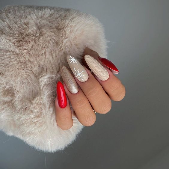 Nothing says holiday spirit like a striking red and soft winter neutral combo. These long, acrylic nails incorporate solid color red nails alongside glittery accents and delicate snowflakes. The almond shape gives these nails a classy vibe, while the 3D cable knit design on one nail adds a cozy texture, reminiscent of a warm winter sweater. This design is ideal for festive gatherings, weddings, or a bridesmaid look at a winter event, bringing together both elegant and fun elements.