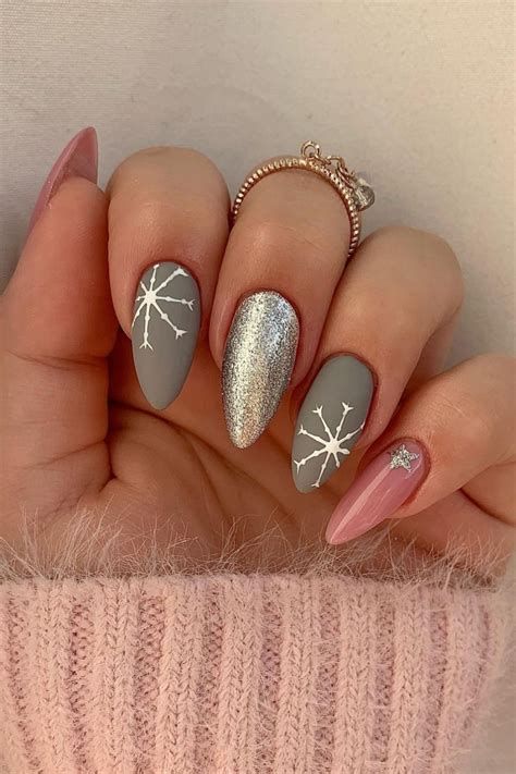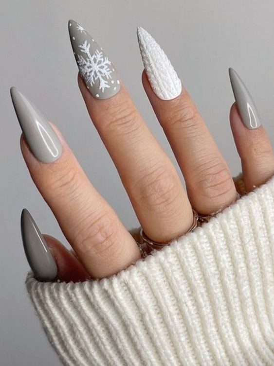 This winter nails idea exudes elegance with its soft grey tones, silver glitter, and delicate snowflake designs. The almond-shaped nails are perfect for a formal occasion like a winter wedding or birthday celebration, where you want a bit of sparkle without going overboard. The use of rhinestones around the snowflake adds a touch of glamour, while the contrasting white snowflakes on a grey background are reminiscent of a crisp winter day. The touch of glitter on the accent nail keeps the design chic and classy.