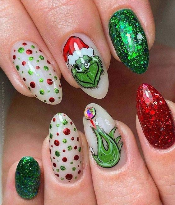 Bring out your funky side this Christmas with these Grinch-themed nails. This multicolor design combines glittery green, red, and polka dots to create a playful holiday look. The Grinch’s face is detailed on one accent nail, making this a bold and fun option for any casual or funky holiday event. The mix of vibrant colors and glitter will definitely capture attention and bring a smile to anyone who sees them. If you’re someone who loves to stand out, this fun and edgy design is perfect for you.