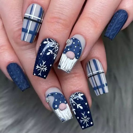 Embrace the cute side of winter with this gel nail set featuring plaid patterns and adorable gnome art. The bold blue tones add a fun and funky vibe, while the plaid gives it a wintery, cozy touch that feels perfect for casual winter days. The gnome, decked out with snowflakes and winter attire, adds a playful twist, making this nail art idea perfect for those who like to incorporate a little fun into their 2024 trends. The mix of almond and square nail shapes provides a dynamic look, while the short, gel nails are practical and perfect for daily wear.