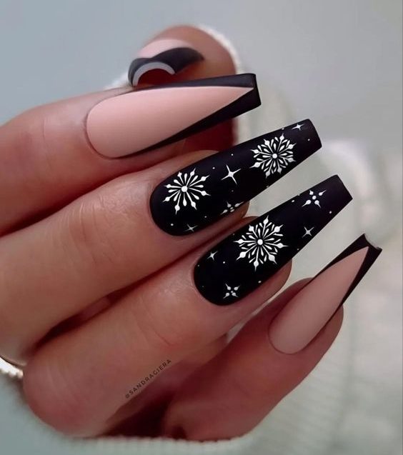 For a classy and dramatic look, this black and nude combo is perfect for the winter months. The long, square nails feature sleek black with snowflakes, offering a beautiful contrast against the neutral, matte nude base. The geometric accents and sparkling details give this design an elegant edge, making it suitable for formal occasions or a bridesmaid look. If you want your winter nails to have a sophisticated flair, this elegant design is a great choice for winter 2024-2025.