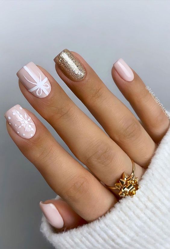 For a more minimalist winter nail art approach, this design uses nude and pale tones with subtle plaid detailing on the accent nails. The short, square nails are great for everyday wear, while the plaid pattern, with its thin gold lines, gives it a touch of festive flair without being over-the-top. The white snowflake on the ring finger adds a soft wintry touch, making these nails ideal for a cozy day by the fire or a casual winter gathering.