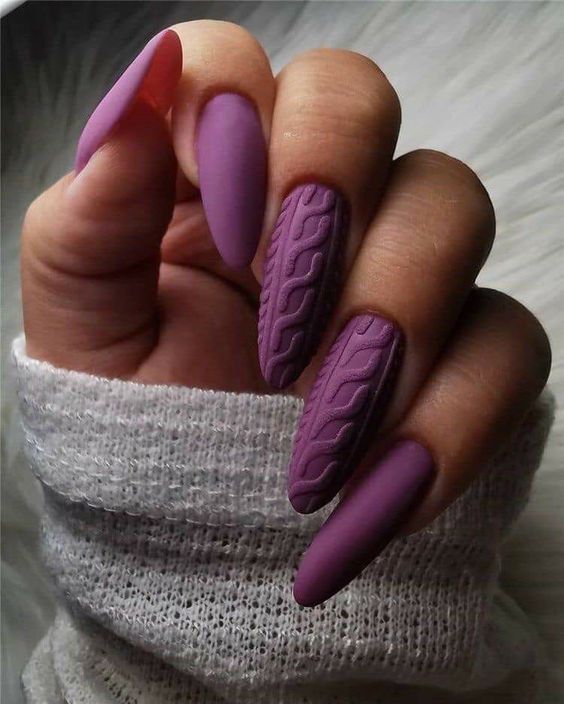 If you’re looking for a simple yet cozy design, this matte purple set with cable knit detailing is perfect. The deep purple shades are reminiscent of warm sweaters, and the raised knit pattern brings a cozy, wintery texture to the design. These gel nails are ideal for an autumn-to-winter transition, keeping things elegant while maintaining a casual feel. The solid color and texture also make this design versatile for both formal occasions and casual outings, making it a great choice for those who want an understated yet stylish look for the colder months.