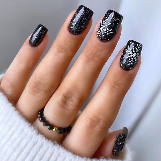 For those who prefer a darker, more edgy winter look, these gel nails in black with white snowflakes are a bold statement. The long, square nails are painted with a black glittery polish, giving them a starry night sky effect. The hand-painted snowflakes on two accent nails provide a striking contrast against the dark background, offering a chic and classy winter vibe. This design is perfect for those who want something unique and bold for the winter season.