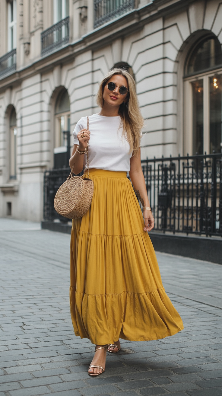 What makes this combo special is the balance between drama and ease. The mustard skirt brings length and presence, while the tee reins it back into everyday territory. You can dress it up with gold hoops and a red lip or lean casual with sneakers and a denim jacket for subtle street style. This is one of those ideas that works across seasons too: in spring, layer a light trench; when it’s cooler, swap sandals for ankle boots, and you’re done.